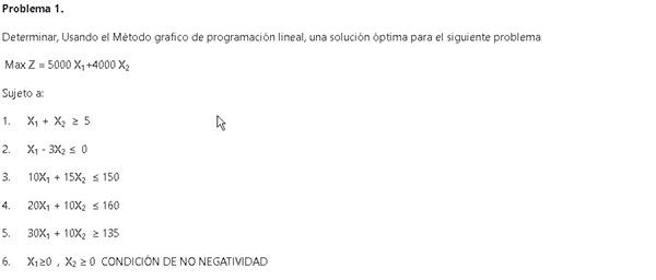 Es lo mismo que decirte, encuentra el k más alto posible. Esto porque ahora tienes 4000x+5000y=k. Entonces max 4000x+5000y es lo mismo que maximizar .Obviamente la k esta restringida por tus restricciones sucede cuando tu recta se sale por completo de la región factible. El punto limite en este caso sucede cuando k=50.5 (o 50.5*1000 porque lo dividi entre 1000). Y por definicion todos los puntos que pertenecen a dicha recta cumplen 4000x+5000y = 50500. ¿Cuál es la solución? Pues los puntos de tu región factible que pertenecen a tu recta, en este caso solo el vértice (4.5,7). Entonces x=4.5 e y=7 es tu solución y el valor de la función objetivo es 50500. Otro caso que se puede dar es que tu recta coincida con un lado de tu región factible, en ese caso es porque existen infinitas soluciones (todos los puntos que pertenecen a ese lado).