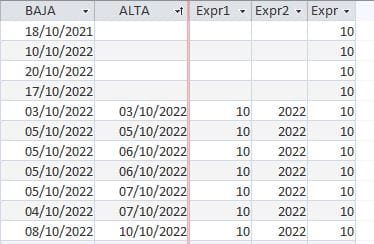 Pues bien... Todo esto funcionaba correctamente hasta que ha llegado el mes de octubre. No sé si es cuestión de que toma el 10 como número menor que 09 pero en la consulta solo me lanza aquellas personas que se han dado de baja en el mes de octubre y no me recoge aquellas que se han dado de baja en meses anteriores y todavía siguen de baja en el mes de octubre