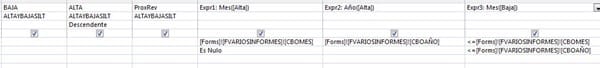 Y he creado una consulta para que me filtre las personas que han estado de baja y/o se han dado de alta en el mes elegido,. Esta consulta me lanzaba las personas que se habían dado de baja médica antes o durante el mes selecciona y que bien, podían tener el alta o seguir de baja durante el mes seleccionado. La finalidad última es saber a través de un informe cuantos días ha estado de baja una personas durante un mes determinado