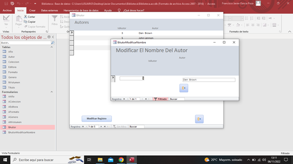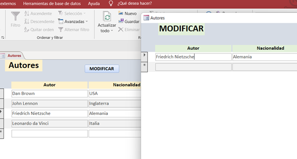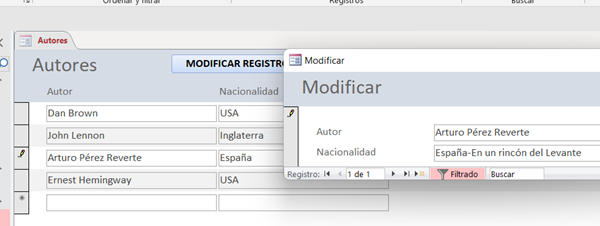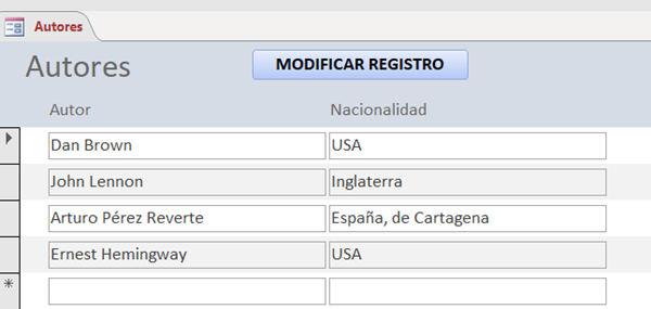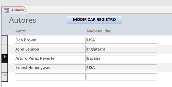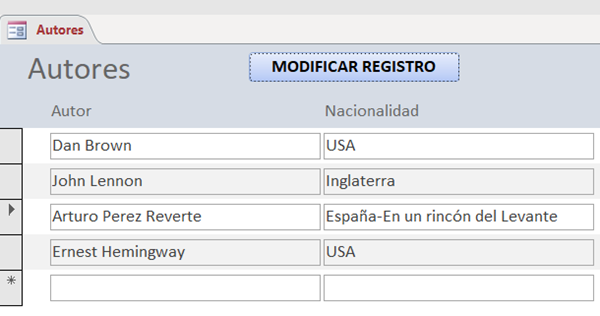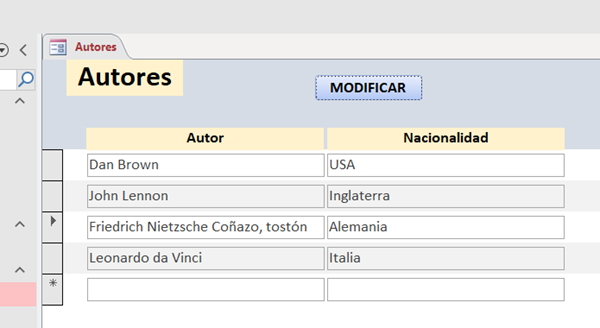 Además, da la impresión de que el formulario Modificar también tiene como origen de registros la propia tabla Autores ( no tendría sentido crear un formulario independiente y tener que insertar los valores que ya están en el formulario Autores). Por tanto, si ese es el caso