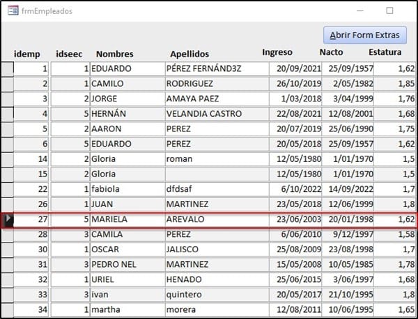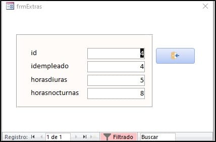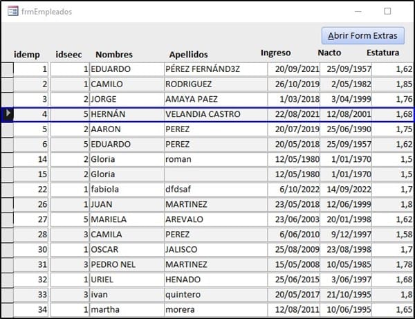 Selecciono el idempleado 4 y hago clic sobre el botón Abrir Form Extras, obtengo: