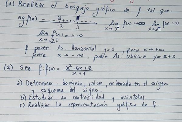 Segundo ejercicio: Dominio: El numerador es un polinomio por lo que no tiene limitantes; el denominador se hace 0 cuando x=(-1) por lo que allí habrá una asíntota vertical. Entonces el dominio será: Para todo x =/= (-1).