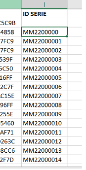 Al final lo que necesito que el .bat me pregunte por el código inicial, le pongo por ejemplo MM22000120, y si tengo en el Excel 5 filas de registros me tiene que rellenar la columna I-3 de la siguiente forma: