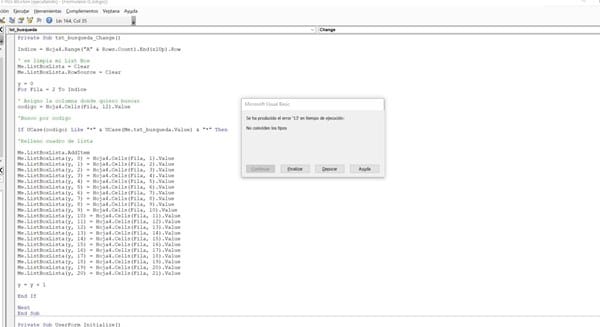 Private Sub txt_busqueda_Change() Indice = Hoja4.Range("A" & Rows.Count).End(xlUp).Row ' se limpia mi Lixt Box Me.ListBoxLista = Clear Me.ListBoxLista.RowSource = Clear y = 0 For Fila = 2 To Indice ' Asigno la columna donde quiero buscar codigo = Hoja4.Cells(Fila, 12).Value 'Busco por codigo If UCase(codigo) Like "*" & UCase(Me.txt_busqueda.Value) & "*" Then 'Relleno cuadro de lista Me.ListBoxLista.AddItem Me.ListBoxLista(y, 0) = Hoja4.Cells(Fila, 1).Value Me.ListBoxLista(y, 1) = Hoja4.Cells(Fila, 2).Value Me.ListBoxLista(y, 2) = Hoja4.Cells(Fila, 3).Value Me.ListBoxLista(y, 3) = Hoja4.Cells(Fila, 4).Value Me.ListBoxLista(y, 4) = Hoja4.Cells(Fila, 5).Value Me.ListBoxLista(y, 5) = Hoja4.Cells(Fila, 6).Value Me.ListBoxLista(y, 6) = Hoja4.Cells(Fila, 7).Value Me.ListBoxLista(y, 7) = Hoja4.Cells(Fila, 8).Value Me.ListBoxLista(y, 8) = Hoja4.Cells(Fila, 9).Value Me.ListBoxLista(y, 9) = Hoja4.Cells(Fila, 10).Value Me.ListBoxLista(y, 10) = Hoja4.Cells(Fila, 11).Value Me.ListBoxLista(y, 11) = Hoja4.Cells(Fila, 12).Value Me.ListBoxLista(y, 12) = Hoja4.Cells(Fila, 13).Value Me.ListBoxLista(y, 13) = Hoja4.Cells(Fila, 14).Value Me.ListBoxLista(y, 14) = Hoja4.Cells(Fila, 15).Value Me.ListBoxLista(y, 15) = Hoja4.Cells(Fila, 16).Value Me.ListBoxLista(y, 16) = Hoja4.Cells(Fila, 17).Value Me.ListBoxLista(y, 17) = Hoja4.Cells(Fila, 18).Value Me.ListBoxLista(y, 18) = Hoja4.Cells(Fila, 19).Value Me.ListBoxLista(y, 19) = Hoja4.Cells(Fila, 20).Value Me.ListBoxLista(y, 20) = Hoja4.Cells(Fila, 21).Value y = y + 1 End If Next End Sub