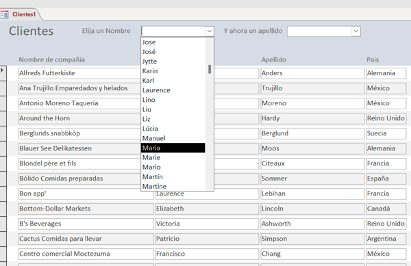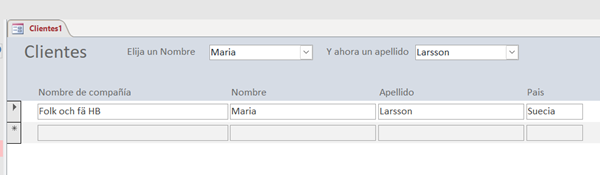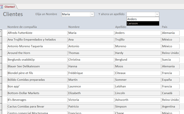 Es decir, que el origen de registros del formulario, sean aquellos de la tabla Clientes, en que su nombre coincida con el elegido en el primer combinado y su apellido coincida con lo elegido en el segundo combinado.