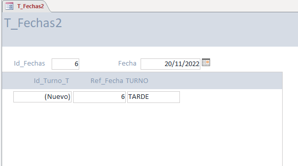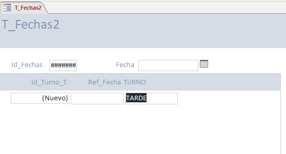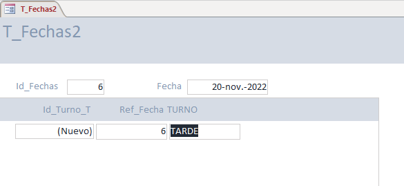 Las dos tablas están relacionadas por: tabla de fechas como principal por su Id, y la tabla turno en el subf por Ref_Fecha, la relación es uno al infinito