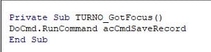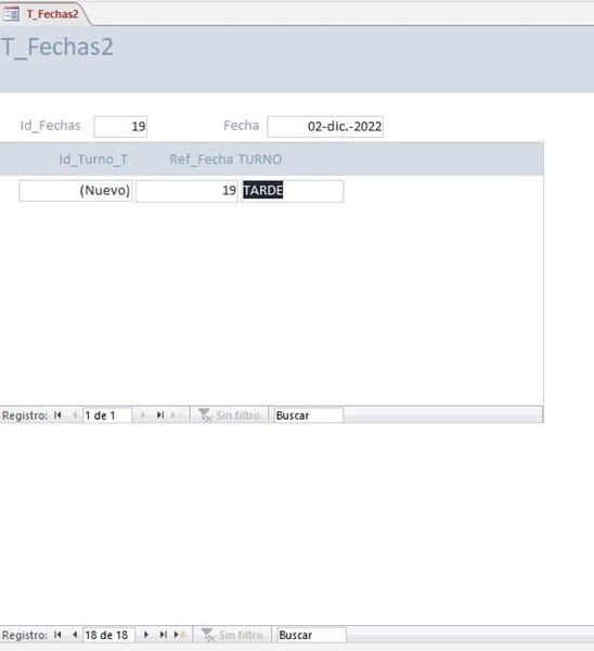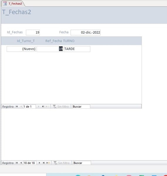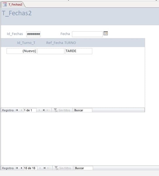En la captura fom1 es cuando carga el Formulario y llevo el cursor al campo fecha, luego introduzco la fecha y en cuanto tabulo, va el enfoque al subformulario y al campo turno, y ya aparece en la Ref_Fecha el número que le corresponde, pero en el Id_Turno_T, no cuenta, y porlotanto no se genera el registro y no guarda nada en la tabñla que le corresponde. Y con relación a tu pregunta, en cuanto tabulo va pasando por cada uno de los campos según su orden de tabulación, por el formulario principal, pero en este caso como ya estoy en la fecha, orden tab 1, desde hay lo paso con código al subformulario y luego al cam`por turno, cuyo valor es predetrminado y este es el problema, no genera el registro al tabular o al darle enter. Tampoco sale del subformalrio ya que no le he puesto nada para que lo haga.
