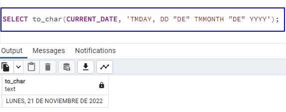 To_char --- Es una función de PostgreSQL para convertir datos en cadena de texto, en este caso la fecha actual