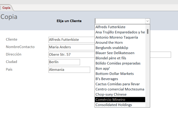 Es muy sencillo. Al no saber como es la consulta voy a usar la tabla Clientes. Con ella creo un formulario (da igual que sea único o continuo), al que le voy a añadir un combinado llamado ElegirCliente, con las columnas IdCliente y cliente de la tabla. Sólo muestra la segunda columna pero la dependiente es la de Idcliente