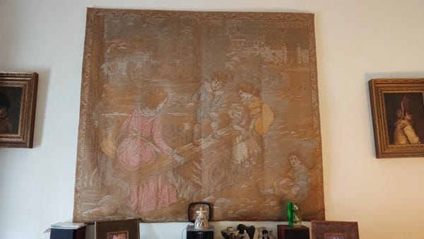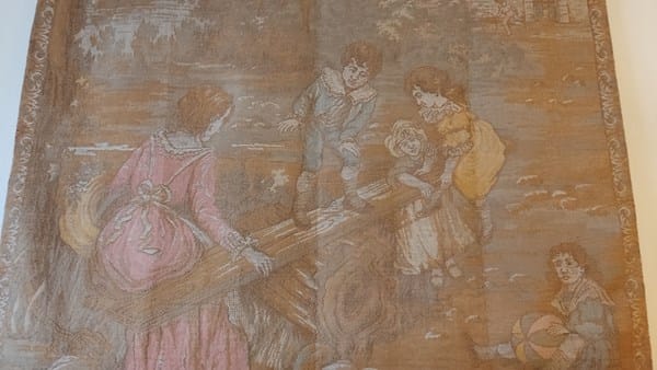 He heredado este otro tapiz antiguo y no consigo averiguar si tiene o no tiene valor. ¿Me podrían decir algo sobre él? ¿Merece la pena venderlo? Es grande y los tintes están un poco claros. Medidas 130alto x155 ancho
