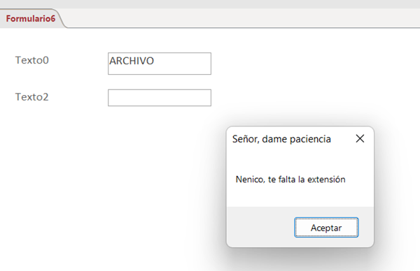 Private Sub Texto0_BeforeUpdate(Cancel As Integer) If Texto0.Text <> "*.*" Then MsgBox "Nenico, te falta la extensión", vbOKOnly, "Señor, dame paciencia" Cancel = True End If End Sub