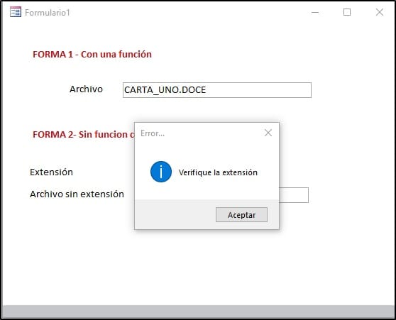 Public Function Verifica_Tipo(X_Texto) As String Dim X_Validos$, X_Posicion& Verifica_Tipo = "Extension incorrecta" X_Posicion = InStrRev(X_Texto, ".") If X_Posicion = 0 Then Exit Function X_Validos = "txt-doc-docx-xls-xlsx-mdb-ppt-" If InStr(X_Validos, Mid(X_Texto, X_Posicion + 1) & "-") <> 0 Then Verifica_Tipo = "Extension aceptada" End Function