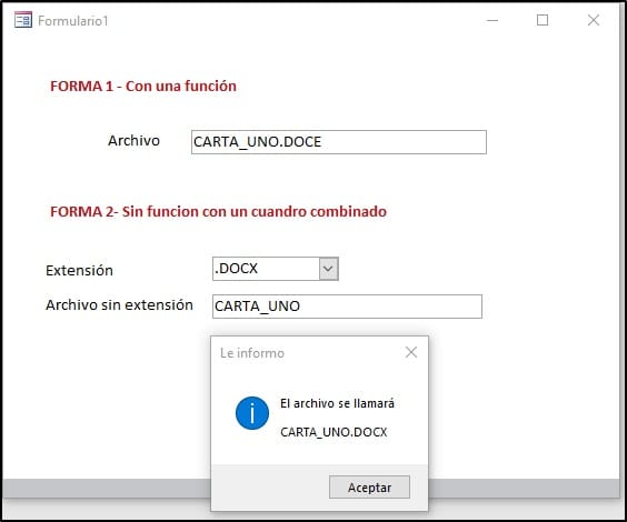 En esta imagen tomé la forma 2, utilizo un cuadro combinado con la lista de extensiones y lo condiciono a Limitar a la lista en SI. Como la extensión es correcta me indica como se llamará el archivo.