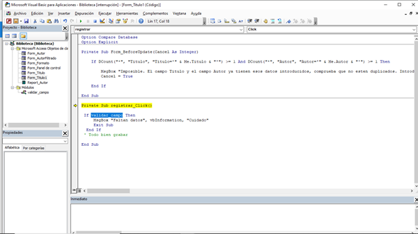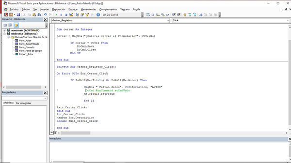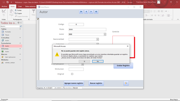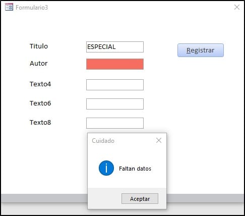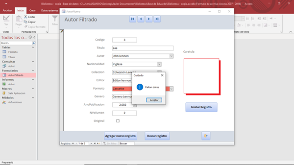 Llevo un montón de horas con el tema y copiando de varios ejemplos que he encontrado y la verdad no consigo completar la rutina. Te pido el favor de mirar en el formulario autor filtrado y ver como pongo los campos que están vacíos me para que salga un mensaje diciendo que el campo está vacío, y se coloque el cursor en dicho campo marcado en un color y hasta que no estén todos completos no se grabe el registro con el botón grabar datos. Una vez grabado se ponga el formulario de nuevo para grabar datos y con los campos en blanco.