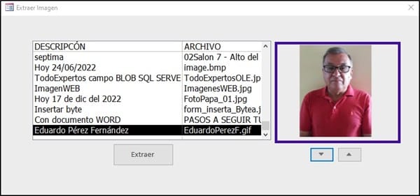 Anoto en el campo "Descripción" la información sobre el contenido de la imagen, en el campo "Archivo" hago clic sobre el botón de la carpeta y selecciono una imagen, esta aparece como muestra la imagen. Para seleccionar la imagen utlizo msoFileDialogFilePicker, no lo explico porque asumo que ya sabe cómo se utiliza.