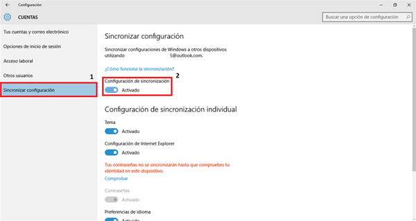 3. Selecciona la opción Sincronizar configuración. Luego, desactiva Configuración de sincronización.