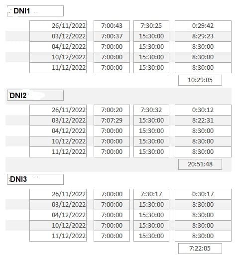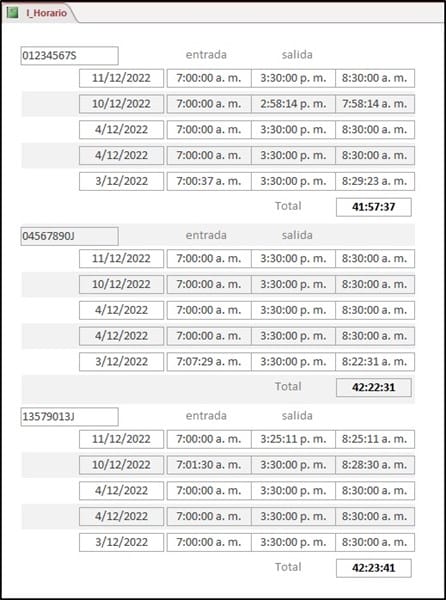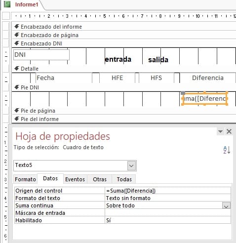 Con esta consulta, creo un informe que agrupo por DNI (encabezamiento). En este agrupamiento, incluyo el DNI, y en el detalle incluyo la fecha a la que asiste, la hora final de entrada, la hora final de salida y la diferencia.