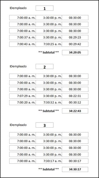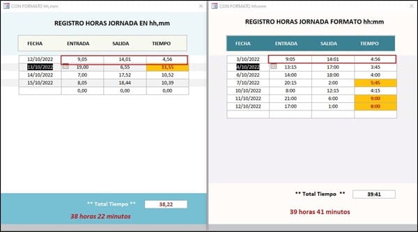 Los campos HORA, todos tienen el formato Hora larga.