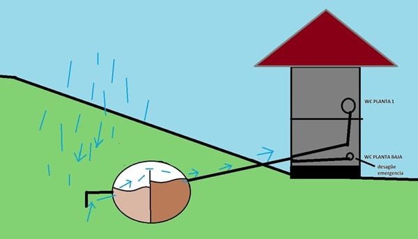 Bien, tengo un problema. Donde vivo no hay saneamiento y las aguas negras van a una depuradora que está en una zona del terreno que es más baja que el resto de terreno, es una depuradora de PVC (o lo que sea) de dos cámaras y resulta que donde vivo (Galicia) llueve mucho (MUCHO) y la tierra no es capaz de absorber tanta agua y la depuradora me acaba bordando. Donde va a ir el WC de abajo ahora tengo un tubo con salida hacia afuera y por ahora voy zafando cuando se llena, pero es un problema bastante importante, tanto que ahora lo tengo puesta una bomba (de superficie, la manguera de admisión de agua está metido por una de las chimeneas de la depuradora)