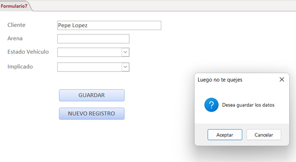 Una vez rellenados todos los campos, he puesto un mensaje donde digo si deseo guardar los datos, una vez aceptados, me vuelve a salir otro mensaje donde digo los datos han sido guardados y si deseo dar una nueva alta. Pero aquí es cuando me sucede lo siguiente, cuando intento dar de alta otro nuevo registro, una vez borrados todos los datos del formulario, y si deseo dar un alta y no existen datos en los tres campos mencionados anteriormente no me los rellena, con ------.