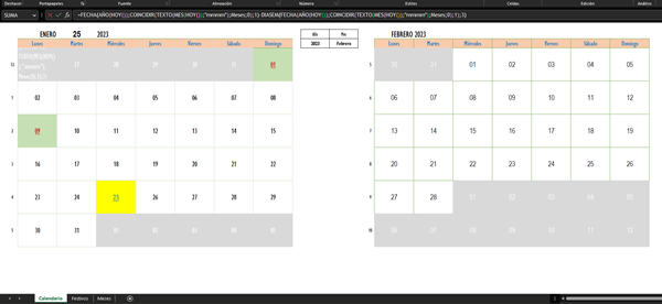 En las capturas de pantalla que les compartiré, tengo 2 calendarios, el automático funciona bien, pero solo para el mes de enero, mientras que también tengo uno que usa columnas auxiliares, tales como AÑO y MES, con ese, no se presenta el problema que se presenta con la fórmula, es decir; si funciona bien, pero mi intención, es no usar columnas auxiliares.