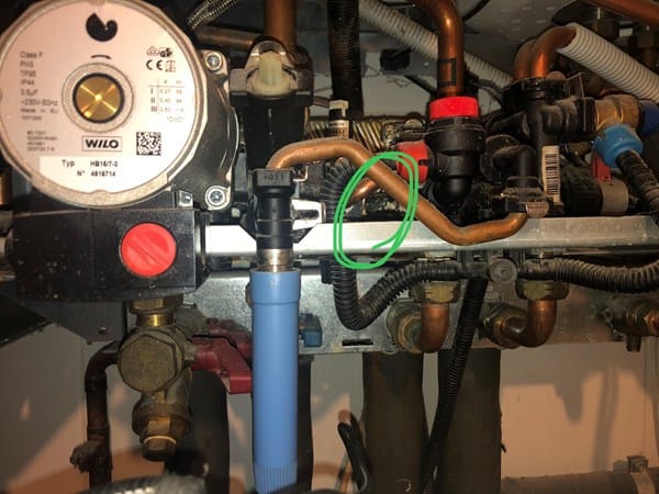 Mi caldera ha empezado a fallar al encender la calefacción este invierno. Si sólo tengo encendida el agua caliente no falla, si pongo la calefacción si. Pierde agua por un tubo negro que se ve en las fotos, es como si le faltara un taponcito. Es arrancar la calefacción y empieza a pingar sin parar, lleno un cubo de agua grande en medio día.