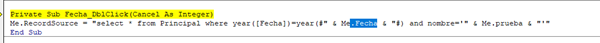 y en Fecha factura este otro Me.RecordSource = "select * from ConsultaFacturas where year([Fecha])=year(forms!Principal!Fecha)"