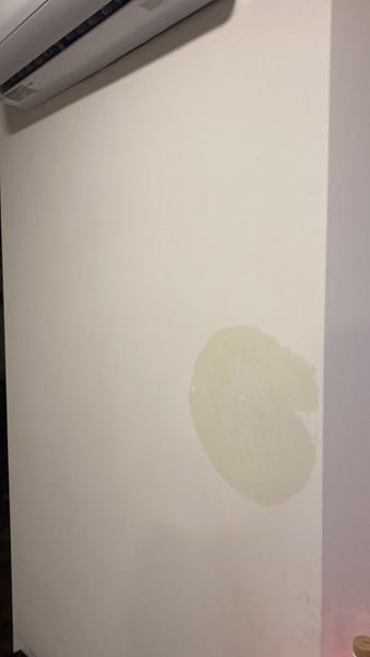 Desde que instale el aire acondicionado en mi departamento, se produce una mancha de humedad debajo de este, la cual se humedece cuando está prendido y se seca cuando lo apago, por lo cual es este el causante de la mancha. Proviene del interior de la pared ya que por fuera el aire no gotea.
