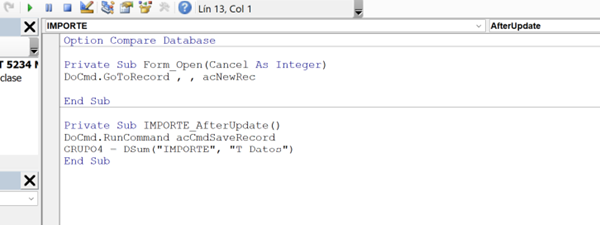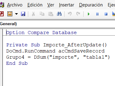Private Sub Importe_AfterUpdate() DoCmd.RunCommand acCmdSaveRecord Grupo4 = DSum("importe", "T Datos") End Sub