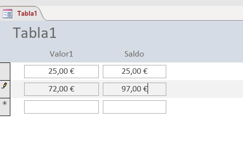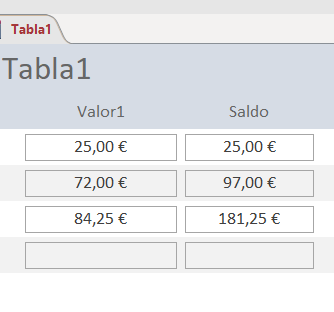 Es una Tabla en la que quiero que conforme vaya introduciendo los datos de Importe, me vaya haciendo la suma del Saldo del campo anterior más el valor del nuevo importe.