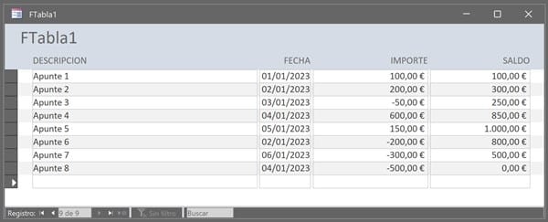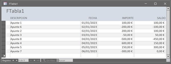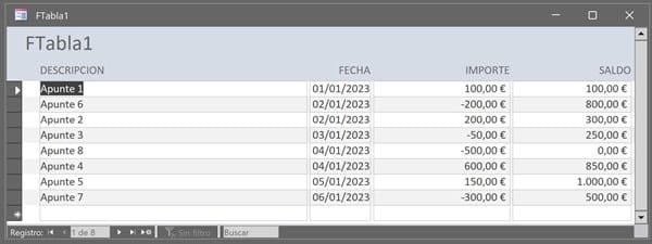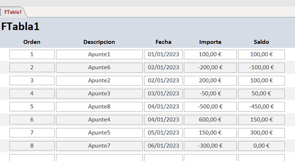 Con lo que si modificas algún valor o eliminas algún registro, cada vez que abras el formulario te "recalculará" todo. El saldo correcto lo tendrás siempre en el formulario no en la tabla, ya que en ella están ordenado por entrada no por fecha.