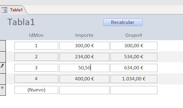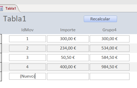 Private Sub Importe_AfterUpdate() DoCmd.RunCommand acCmdSaveRecord Grupo4 = DSum("importe", "tabla1", "idmov<=" & Me.IdMov & "") End Sub