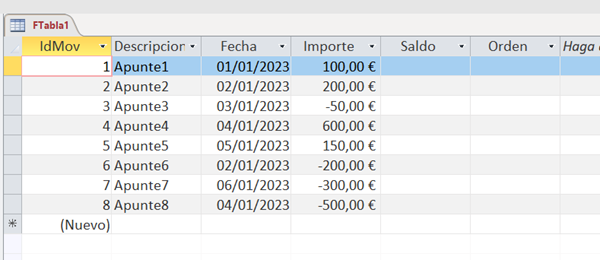 CAPTURA 02: Esta es la vista del Formulario tras cerrarlo y volverlo a abrir. Los registros se han reordenado según el criterio de la Consulta por FECHA. Los valores de IMPORTE son correctos pero el SALDO es incorrecto. No ha hecho la suma del valor de IMPORTE más el último valor de SALDO y el resultado en el último registro no es correcto.