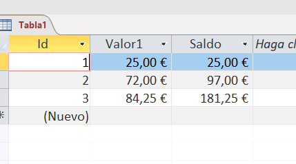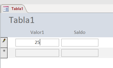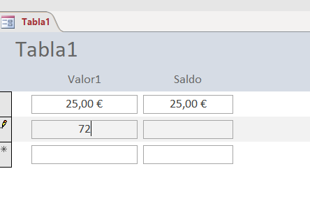 Private Sub Valor1_AfterUpdate() DoCmd.RunCommand acCmdSaveRecord Saldo = DSum("valor1", "tabla1") End Sub