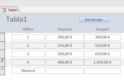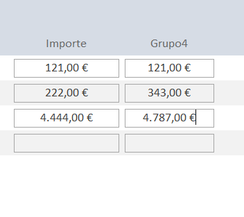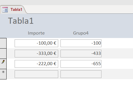 Esta acción con Excel como ejemplo, sería: si tienes columnas A (Importe) y B (Saldo), la fórmula sería B2= B1+A2; B3=B2+A3; B4=B3+A4; etc. de forma que no sumara los valores del campo "IMPORTE" sino que tomara el último valor de la columna "GRUPO4" y le sumara el siguiente de la columna "IMPORTE". Así, cada vez que introduzca un nuevo valor, cuando se muestre en el Formulario ordenado por fecha del dato, me haga siempre la suma del saldo en ese Registro a esa fecha.