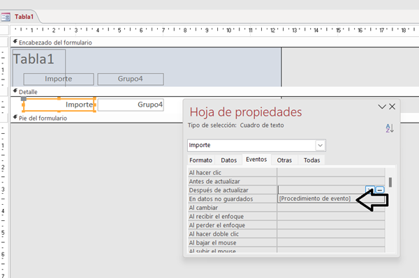 Si tengo el formulario, al que sólo le he puesto dos campos de la tabla, y en vista diseño selecciono el control Importe y en sus propiedades-eventos pongo el cursor en el rectángulo de la derecha del evento Después de actualizar, me aparecen una punta de flecha y un botón de tres puntos. Si "despliego" la punta de flecha, me aparece Procedimiento de evento, lo selecciono y luego pulso el botón de los tres puntos(puedes ver que el cursor está a la derecha de Después de actualizar)