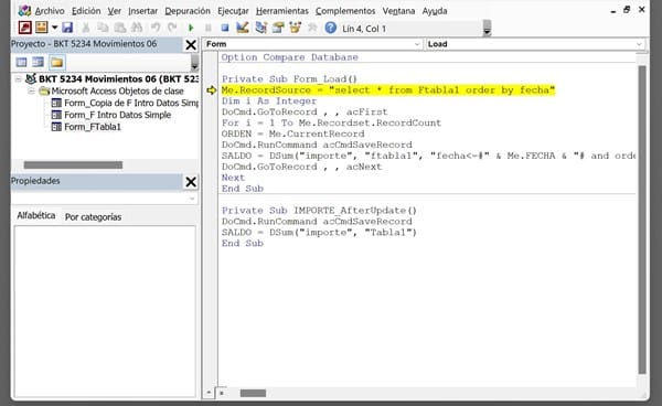 Private Sub Form_Load() Me.RecordSource = "select * from Ftabla1 order by fecha" Dim i As Integer DoCmd.GoToRecord , , acFirst For i = 1 To Me.Recordset.RecordCount Orden = Me.CurrentRecord DoCmd.RunCommand acCmdSaveRecord Saldo = DSum("importe", "ftabla1", "fecha<=#" & Me.Fecha & "# and orden <=" & Me.Orden & "") DoCmd.GoToRecord , , acNext Next End Sub