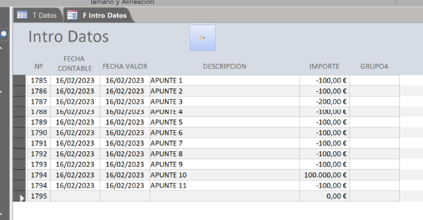 CAPTURA 03: Esta es una captura de datos "forzada" para que se vean cuál debería ser el comportamiento del Formulario tras cerrar y volver a abrir. En esta vista se ve que las fechas son correlativas independientemente del momento de introducción del Apunte y el SALDO es correcto en todos los Registros.