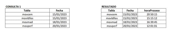 En el resultado de una consulta1, la columna tabla me entrega los nombres de las tablas y fechas que debo revisar en dichas tablas una por una.
