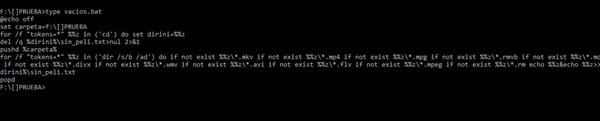 @echo off Setlocal EnableDelayedExpansion set carpeta=f:\[]PRUEBA for /f "tokens=*" %%z in ('cd') do set dirini=%%z del /q %dirini%\sin_peli.txt>nul 2>&1 pushd %carpeta% for /f "tokens=*" %%z in ('dir /b /ad') do ( set control=S call :tratadir "%carpeta%\%%z" if !control!==S (echo %carpeta%\%%z&echo %carpeta%\%%z>>%dirini%\sin_peli.txt) ) popd goto :eof :tratadir for %%e in (.mkv .mp4 .mpg .rmvb .mov .divx .wmv .avi .flv .mpeg .rm) do ( if exist %~1\*%%e (set control=N&goto :eof) for /f "tokens=*" %%a in ('dir "%~1" /b/s /ad') do if exist %%a\*%%e (set control=N&goto :eof) )