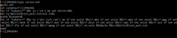 @echo off set carpeta=d:\carpeta prueba for /f "tokens=*" %%z in ('cd') do set dirini=%%z del /q %dirini%\sin_peli.txt>nul 2>&1 pushd %carpeta% for /f "tokens=*" %%z in ('dir /s/b *.*') do if not %%~xz==.mkv if not %%~xz==.mp4 if not %%~xz==.mpg if not %%~xz==.rmvb if not %%~xz==.mov if not %%~xz==.divx if not %%~xz==.wmv if not %%~xz==.avi if not %%~xz==.flv if not %%~xz==.mpeg if not %%~xz==.rm echo %%z&echo %%z>>%dirini%\sin_peli.txt popd