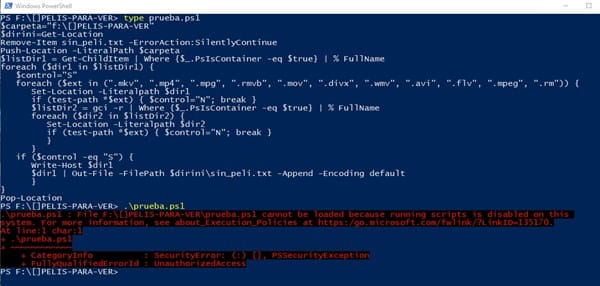 Te sitúas en la unidad/carpeta correspondiente a []PRUEBA, tecleas un TYPE para ese PS1 (para poder ver si tiene el último cambio incluido) y ejecutas el PS1 tecleando su nombre (como harías con un BAT) pero precedido de ".\", es decir si al PS1 le has llamado VACIOS. PS1 debes teclear: