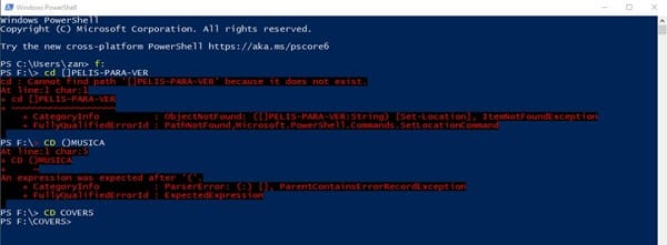Como verás en la captura adjunta, aún para cambiar de directorio, los [ ] y los ( ) se siguen interponiendo. No así en el directorio COVERS al cual PowerShell accede sin problemas.