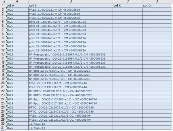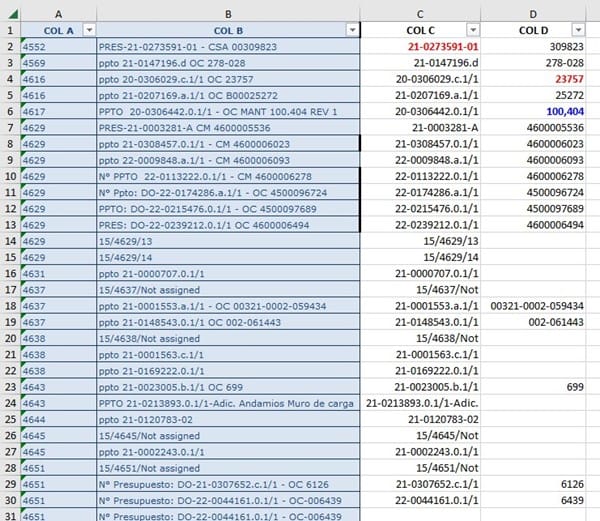 1. Separar solo las cifras numéricas únicas que se encuentren en una celda y ponerlas en celdas separadas (C y D) según el criterio que se ve en la segunda imagen