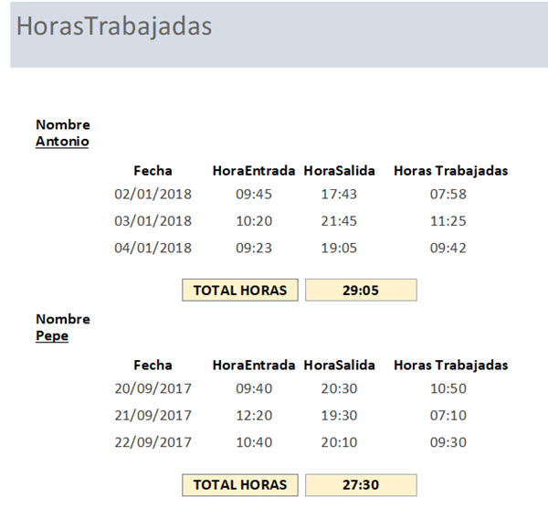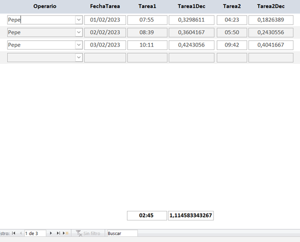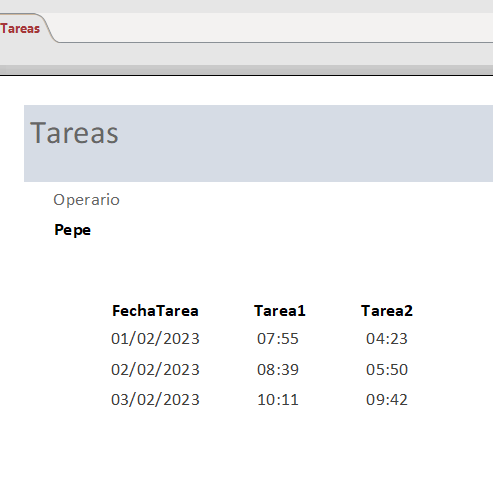 Tengo una aplicación en Access donde se guardan las tareas que realizan los operarios diariamente. Cada día un operario puede realizar N tareas.