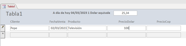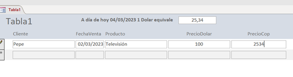 En un formulario de access quiero calcular el valor de un producto en moneda extranjera a moneda local, pero quiero que el tipo de cambio no se me guarde históricamente, sino que solo use el tipo de cambio del diaEjm: un tv que me cuesta 100 USD al multiplicar por el tipo de cambio me de la cantidad en COP por ejemplo, pero al hacer ese mismo calculo al día siguiente y el tipo de cambio varíe al momento de introducir el nuevo tipo de cambio sustituya al del día anterior