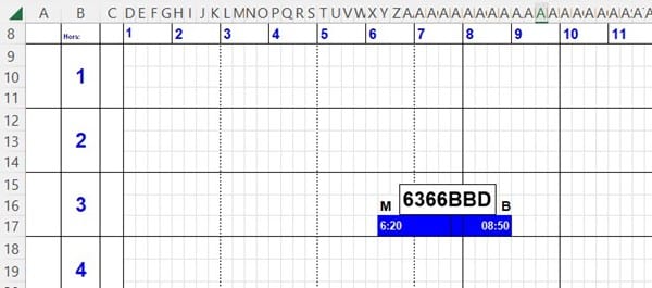 Tengo una hoja y necesitaba ayuda por favor para hacer una macro que yo le diga a la fila de la con el numero 3 (como ejemplo imagen) y me sombre en un color que le indique la hora de comienzo y fin según un formulario que aparecería en pantalla con el cuadro de texto de la matricula del vehículo y la letra de comienzo y fin como en ejemplo. Gracias