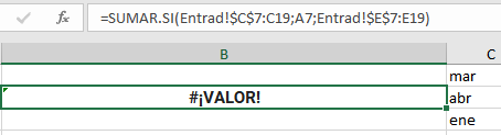 Tengo en una celda Excel la siguiente formula “=SUMAR.SI(Entradas!$C$7:C19;A7;Entradas!$E$7:E19)”