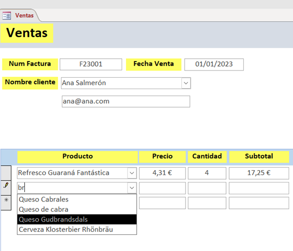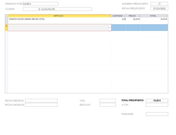 Tengo un formulario que es para hacer presupuestos y dentro tengo un subformulario con el detalle de la venta. Introduzco el nombre de cliente en el formulario principal y luego paso al subformulario para introducir el articulo a presupuestar.