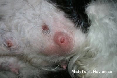 Yo no puedo ayudarle por ignorancia pero estaré encantado de citar o invocar a expertos que puedan orientarle de primera mano, y también buscar más información relacionada, ya que los posibles motivos son muy cuantiosos, como la mencionada mastítis, una alérgia, un quiste, una neoplasia, e incluso un embarazo psicológico, por ello lo ideal, siempre que permanezca la inflamación y aunque sobre decirlo, es que pudiera ser atendida por un médico veterinario, pero tal vez un experto pueda decirle directamente qué le ocurre al ver la imagen de la zona, ojalá podamos orientarle. Ánimo.